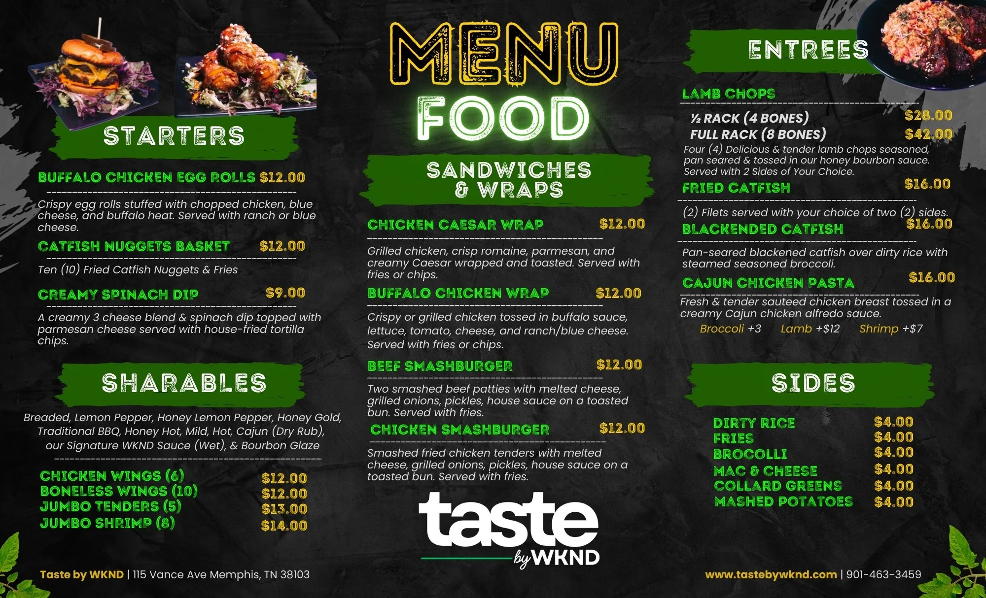 Choose two sides: dirty rice, fries, broccoli, mac & cheese, mashed potatoes & side salad
